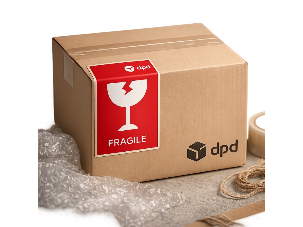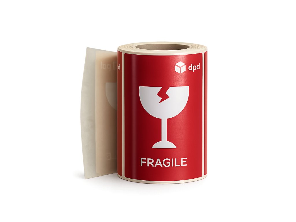 Samolepiace etikety upozorňujúce na krehký obsah zásielky. Zvyšujú bezpečnosť pri manipulácii s balíkmi.